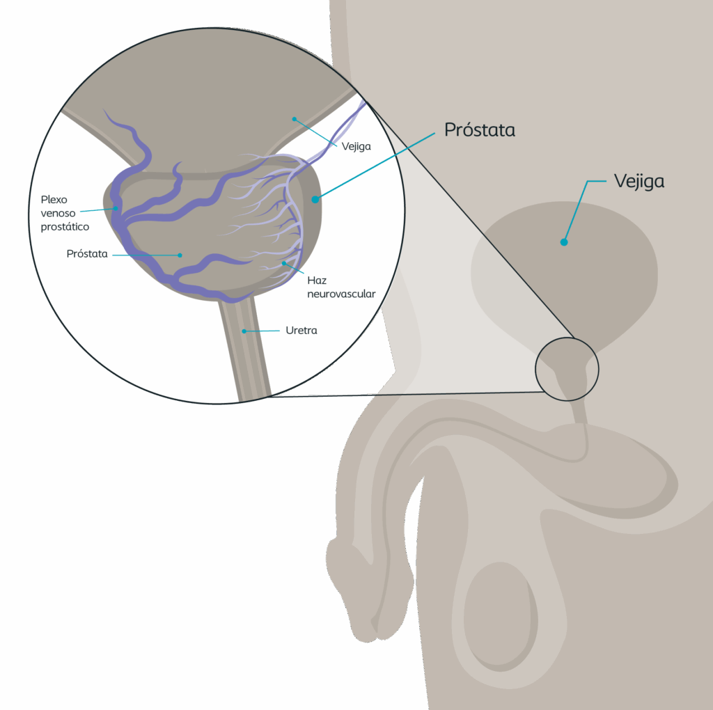 En esta imagen, se muestran los nervios que rodean la próstata y que pueden dañarse durante la extirpación o la radiación de la próstata. La próstata está alrededor de la uretra, que transporta la orina hacia fuera de la vejiga al orinar y también puede dañarse durante los tratamientos contra el cáncer de próstata. Esos daños pueden hacer que los músculos de la vejiga se debiliten y que haya menos soporte alrededor de la uretra, lo que provoca incontinencia.